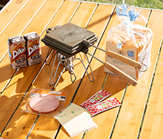 タープ/食事用テーブル/食事用チェア/コンロ(トング付き)/木炭(6kg)/朝食用卓上コンロ/ホットサンドメーカー/包丁、まな板/クーラーボックス